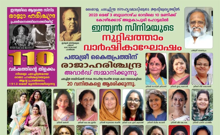 കോഴിക്കോട്: മലയാള ചലച്ചിത്ര സൗഹൃദവേദിയുടെ ആഭിമുഖ്യത്തിൽ ഇന്ത്യൻ സിനിമയുടെ നൂറ്റിപ്പത്താം വാർഷികാഘോഷം മെയ് 3 ബുധനാഴ്ച രാവിലെ 10 മണിക്ക് കോഴിക്കോട് അളകാപുരി ഹോട്ടലിൽ മുൻകേന്ദ്രമന്ത്രി മുല്ലപ്പള്ളി രാമചന്ദ്രൻ ഉദ്ഘാടനം ചെയ്യും. ഇന്ത്യൻ സിനിമയുടെ പിതാവ് ദാദാസാഹേബ് ഫാൽക്കെ നിർമ്മിച്ച് സംവിധാനം ചെയ്ത ഇന്ത്യയിലെ ആദ്യത്തെ സിനിമയായ രാജാഹരിശ്ചന്ദ്രയുടെ ആദ്യ പ്രദർശനം 1913 മെയ് മൂന്നിനായിരുന്നു. നിശബ്ദ ചലച്ചിത്രമാണ് രാജാഹരിശ്ചന്ദ്ര.