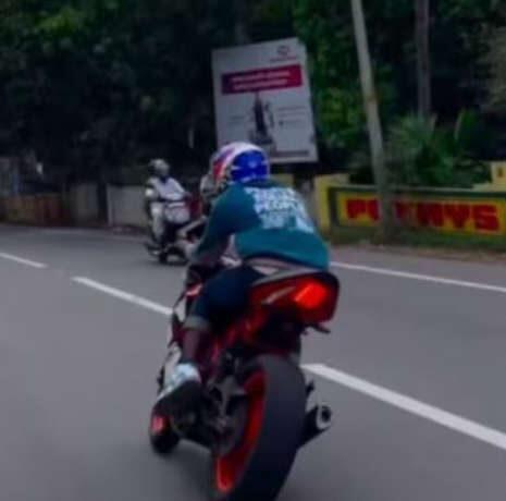 സംഭവം വാര്‍ത്തയാവുകയും വീഡിയോ ശ്രദ്ധയില്‍പ്പെടുകയും ചെയ്തതോടെ പൊലീസ് യുവാവിനെ പിടികൂടുകയായിരുന്നു. അമരവിള-നെയ്യാറ്റിന്‍കര റോഡിലാണ് പ്രതി ബൈക്കില്‍ അഭ്യാസപ്രകടനം നടത്തിയതെന്നാണ് പൊലീസ് പറയുന്നത്. അഭിജിത്തിനെ പിന്നീട് സ്റ്റേഷന്‍ ജാമ്യത്തില്‍ വിട്ടയച്ചു.