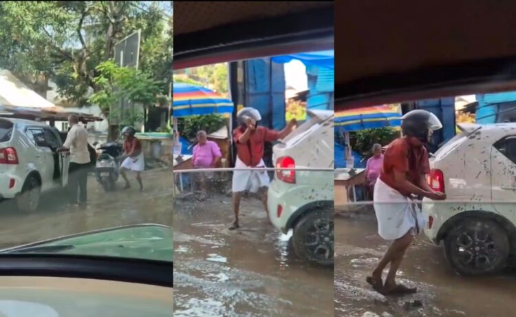 നിലവിലെ ദേശീപാതയില്‍ പടിഞ്ഞാറുവശത്തുകൂടി സ്‌കൂട്ടറില്‍ സഞ്ചരിച്ചയാളുടെ ശരീരത്തില്‍ ഓവര്‍ടേക്ക് ചെയ്ത കാര്‍ ചെളിവെള്ളം തെറിപ്പിക്കുകയായിരുന്നു. ചെളിയില്‍ കുളിച്ച സ്‌കൂട്ടര്‍ യാത്രക്കാരന്‍ കാറിനുപിന്നാലെ വിട്ടു. ഒടുവില്‍ കാറിനെ മറികടന്ന് സ്‌കൂട്ടര്‍ വട്ടംെവച്ചു. ഇതോടെ കാര്‍ പാതയോരത്തേക്ക് ഒതുക്കി. തുടര്‍ന്ന് സ്‌കൂട്ടര്‍ യാത്രികന്‍ ഇറങ്ങിവന്ന് റോഡിലെ ചെളിവെള്ളം കൈകൊണ്ട് കോരി കാറിന്റെ മുകള്‍ഭാഗത്തടക്കം ഒഴിച്ചു. ഹെല്‍മെറ്റ് ധരിച്ചിരുന്നതിനാല്‍ ഇയാളുടെ മുഖം വ്യക്തമല്ല.