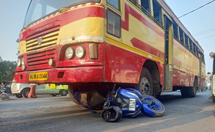 ബസിനടിയിൽപ്പെട്ട സ്കൂട്ടർ യാത്രികൻ രക്ഷപ്പെട്ടത് തലനാരിഴയ്ക്ക്.
