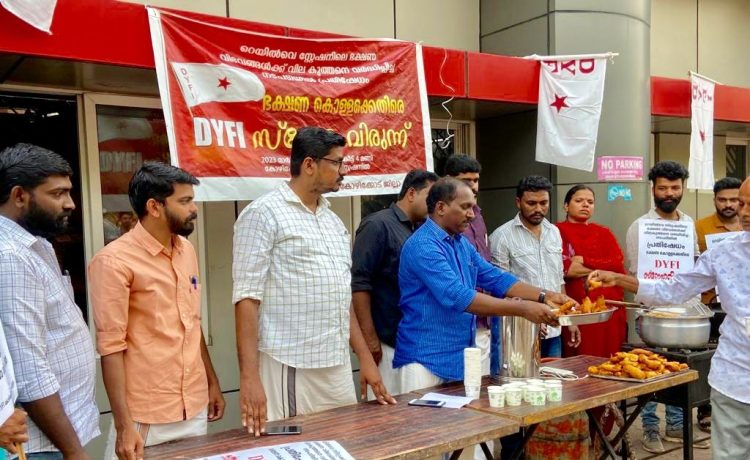 കോഴിക്കോട്: റെയിൽവേ സ്റ്റേഷനിലെ ഭക്ഷണ വിഭവങ്ങൾക്ക് കുത്തനെ വില വർധിപ്പിച്ച ഇന്ത്യൻ റെയിൽവേയുടെ നടപടിയിൽ പ്രതിഷേധിച്ച് ഡി വൈ എഫ് ഐ കോഴിക്കോട് ജില്ലാ കമ്മിറ്റിയുടെ നേതൃത്വത്തിൽ ഭക്ഷണ കൊള്ളക്കെതിരെ സ്നേഹവിരുന്ന് എന്ന പേരിൽ പ്രതിഷേധം സംഘടിപ്പിച്ചു റെയിൽവേ സ്റ്റേഷൻ അങ്കണത്തിൽ