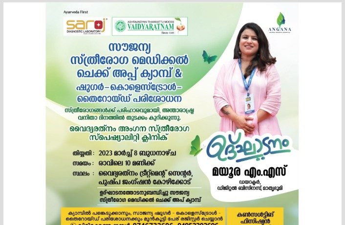 അന്താരാഷ്ട്ര വനിതാ ദിനചാരണത്തിന്റെ ഭാഗമായി കോഴിക്കോട് പുഷ്പ ജംഗ്ഷനിലെ വൈദ്യരത്നം ട്രീറ്റ്മെന്റ് സെന്ററിൽ “അംഗന സ്ത്രീരോഗ സ്പെഷ്യാലിറ്റി ക്ലിനിക്” ആരംഭിക്കുന്നു. മാർച്ച് 8ന് രാവിലെ 10 മണിക്ക്, മാതൃഭൂമി ഡിജിറ്റൽ ബിസിനസ് ഡയറക്ടർ മയൂര. എം. എസ് ക്ലിനിക് ഉദ്ഘാടനം ചെയ്യും.