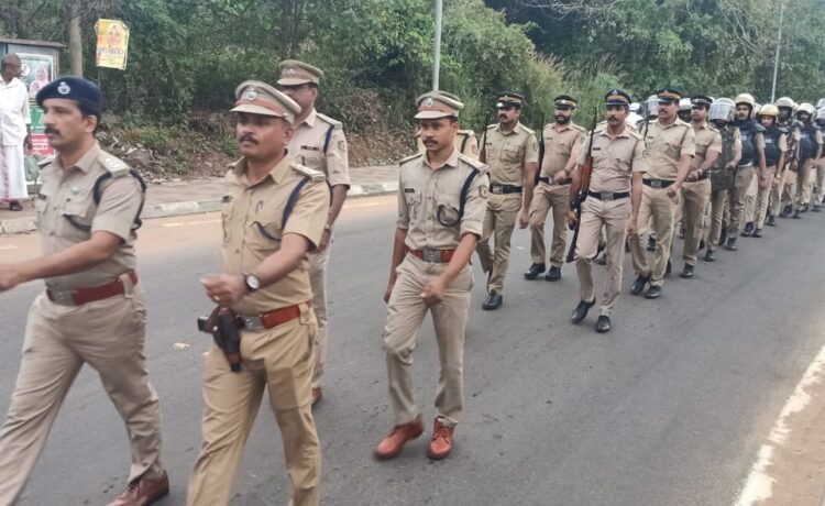 കോഴിക്കോട് : തദ്ദേശ സ്വയംഭരണ തിരഞ്ഞെടുപ്പിന് മുന്നോടിയായ സുരക്ഷാ ക്രമീകരണത്തിന്റെ ഭാഗമായി കോഴിക്കോട് സിറ്റി ജില്ലാ പോലീസ് മേധാവിയുടെ നിർദേശാനുസരണം മാറാട്, ബേപ്പൂർ എന്നീ പോലീസ് സ്റ്റേഷൻ പരിധികളിലെ പ്രശ്ന ബാധിത പ്രദേശങ്ങളിൽ പോലീസ് റൂട്ട് മാർച്ച് നടത്തി.ഫറോക്ക് സബ്ബ് ഡിവിഷൻ അസിസ്റ്റന്റെ് കമ്മീഷണർ ടി.സിദ്ദീഖിന്റെ നേതൃത്വത്തിൽ ബേപ്പൂർ പോലീസ് സ്റ്റേഷൻ ഇൻസപെക്ടർ സുമേഷ്, സബ്ബ് ഇൻസ്പെക്ടർ അംഗജൻ, ബേപ്പൂൂർ പോലീസ് സ്റ്റേഷനിലെയും, കെ.എ.പി നാലാം ബെറ്റാനിയനിലെ സേനാംഗങ്ങൾ സഹിതം 50 ഓളം പേർ ബേപ്പൂർ സ്റ്റേഷൻ പരിധിയിൽ നടന്ന റൂട്ട് മാർച്ചിലും, മാറാട് പൊലീസ് സ്റ്റേഷൻ ഇൻസ്പെക്ടർ റിൻസ്.എം.തോമസ്, സബ്ബ് ഇൻസ്പെക്ടർമാരായ അശ്വിൻ റോയ്, ദിലീപ്, രാജേഷ്, അർജുൻ, ഷാജു, മാറാട് പോലീസ് സ്റ്റേഷനിലെയും കോഴിക്കോട് ഡിസ്ട്രിക്ഹെഡ് ക്വേർട്ടേഴ്സിലെ സേനാംഗങ്ങളടക്കം 50 ഓളം പേർ മാറാട് പോലീസ് സ്റ്റേഷനിലെ റൂട്ട് മാർച്ചിലും അണിനിരന്നു.