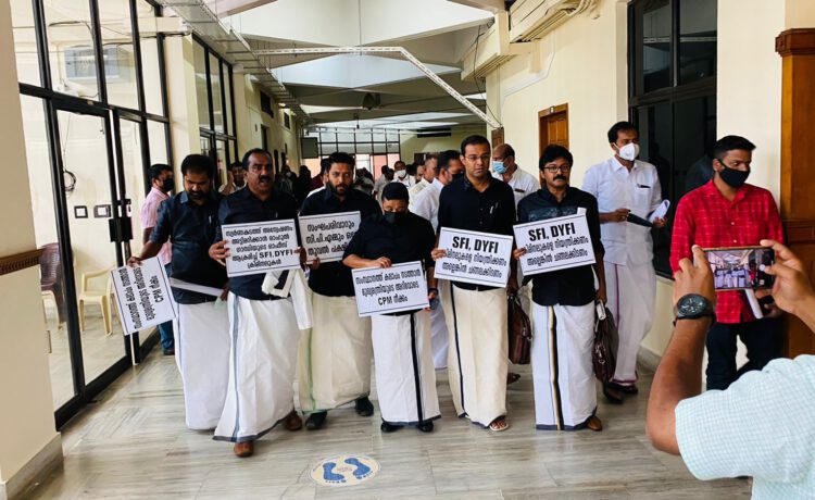 തിരുവനന്തപുരം.: നിയമസഭ സമ്മേളനത്തിന്റെ ആദ്യ ദിനം തന്നെ പ്രതിപക്ഷ പ്രതിഷേധത്തില് മുങ്ങി. ചോദ്യോത്തരവേളയും അടിയന്തര പ്രമേയവും ഒഴിവാക്കിയ സ്പീക്കര് നടപടികള് വേഗത്തിലാക്കി സഭ ഇന്നത്തേക്ക് പിരിഞ്ഞു. രാവിലെ സഭ ചേര്ന്നപ്പോള് തന്നെ പ്രതിപക്ഷം പ്രതിഷേധം തുടങ്ങി. രാഹുല് ഗാന്ധിയുടെ വയനാട്ടിലെ ഓഫീസ് അടിച്ചു തകര്ത്തത് പോലീസിന്റെ അറിവോടെയാണെന്ന് പ്രതിപക്ഷം ആരോപിച്ചു.. സ്പീക്കരുടെ ഡയസിനു മുന്നില് പ്ളക്കാര്ഡുകളുമായി അവര് പ്രതിഷേധിച്ചു. കറുത്ത ഷര്ട്ടും കറുത്ത മാസ്കുമണിഞ്ഞാണ് യുവ പ്രതിപക്ഷ എംഎല്എമാര് പ്രതിഷേധിച്ചത്. ചോദ്യത്തരവേള സ്പീക്കര് ഉപേക്ഷിച്ചു.
