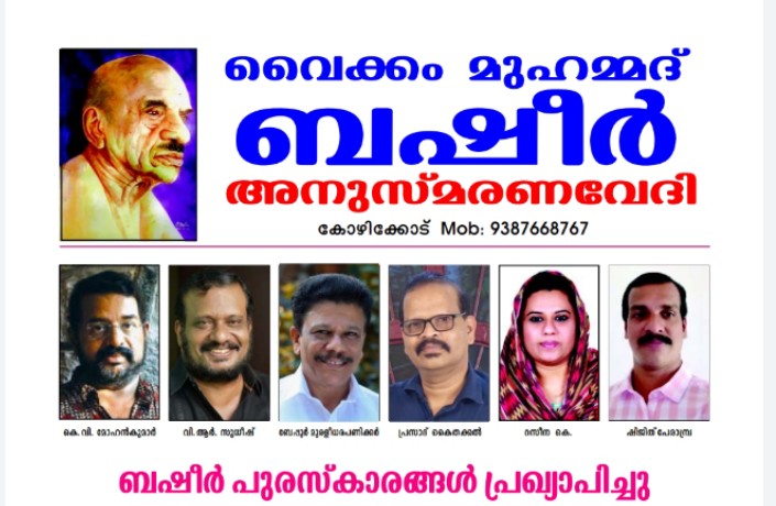 വൈക്കം മുഹമ്മദ് ബഷീർ അനുസ്മരണവേദി കോഴിക്കോടും, കണ്ണൂരിലെ എയറോസിസ് കോളേജ് ഓഫ് ഏവിയേഷൻ & മാനേജ്മെന്റ് സ്റ്റഡീസും സംയുക്തമായി ഏർപ്പെടുത്തിയ ബഷീർ പുരസ്കാരങ്ങൾ പ്രഖ്യാപിച്ചു. പ്രതിഭാ പുരസ്കാരങ്ങൾക്ക് സാഹിത്യകാരന്മാരായ കെ.വി.മോഹൻകുമാർ, വി.ആർ.സുധീഷ് എന്നിവരെ തിരഞ്ഞെടുത്തു.