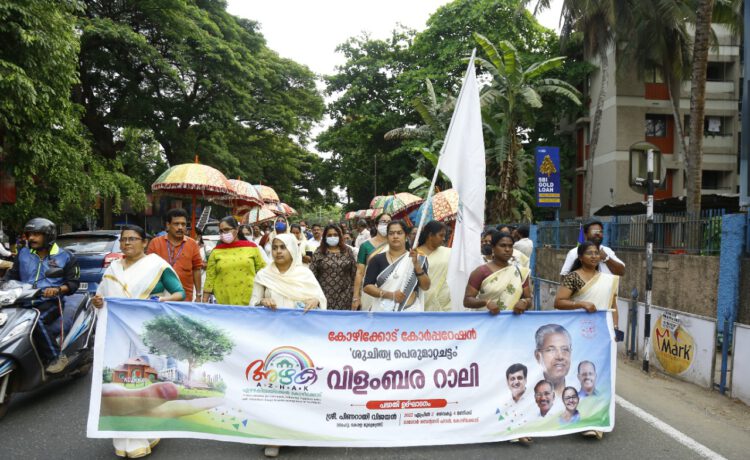 കോഴിക്കോട് :കോര്പ്പറേഷന് നടപ്പാക്കുന്ന സമ്പൂര്ണ ശുചിത്വ പ്രോട്ടോകോള് ‘അഴക്‘ പദ്ധതിയുടെ ഭാഗമായി നഗരത്തില് വിളംബര റാലി നടത്തി. മുതലക്കുളത്തു നിന്നാരംഭിച്ച റാലി കോര്പ്പറേഷന് ഓഫീസ് പരിസരത്ത് സമാപിച്ചു. മേയര് ബീന ഫിലിപ്പ്, ഡെപ്യൂട്ടി മേയര് മുസാഫിര് അഹമ്മദ്, കോര്പ്പറേഷന് സെക്രട്ടറി കെ.യു.ബിനി കൗണ്സിലര്മാര്, പൗര പ്രമുഖര്, കുടുംബശ്രീ, ഹരിതകര്മസേന, ശുചീകരണ തൊഴിലാളികള്, നഗരസഭ ഉദ്യോഗസ്ഥര്, ആരോഗ്യ വിഭാഗം ഉദ്യോഗസ്ഥര്, സര്വീസ് സംഘടനാ പ്രതിനിധികള്, സ്കൗട്ട് ആന്റ് ഗൈഡ്സ്, വ്യാപാരി വ്യവസായി സംഘടനാ പ്രതിനിധികള്, ഹോട്ടല് ആന്റ് റസ്റ്റൊറന്റ് അസോസിയേഷന് അംഗങ്ങള്. സന്നദ്ധ സംഘടനകള് തുടങ്ങി സമൂഹത്തിന്റെ നാനാ മേഖലകളിലുള്ളവര് വിളംബര ജാഥയില് പങ്കെടുത്തു. ‘അഴകുള്ള നഗരമെ അഴകിന്റെ തീരമെ നിന്റെ മൊഞ്ചു കാക്കാന് വന്നിടട്ടെ ഞങ്ങളും’ എന്ന ഗാനം പാടിയാണ് റാലി നഗരത്തിലൂടെ കടന്നു പോയത്.