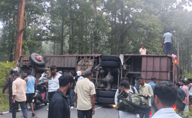 നിരവധി പേര്ക്ക് പരുക്കേറ്റു. ആരുടേയും നില ഗുരുതരമല്ലെന്നാണ് വിവരം. തിരുനെല്ലി തെറ്റ് റോഡില് ഇന്ന് പുലര്ച്ചെ ആറ് മണിയോടെയായിരുന്നു അപകടം. നിയന്ത്രണം വിട്ട ബസ് റോഡിന് കുറുകെ മറിയുകയായിരുന്നു. ബസില് അമ്പതിലധികം പേരുണ്ടായിരുന്നു. പരിക്കേറ്റവരെ വിവിധ വാഹനങ്ങളിലായി മാനന്തവാടി മെഡിക്കല് കോളജിലേക്ക് മാറ്റി.