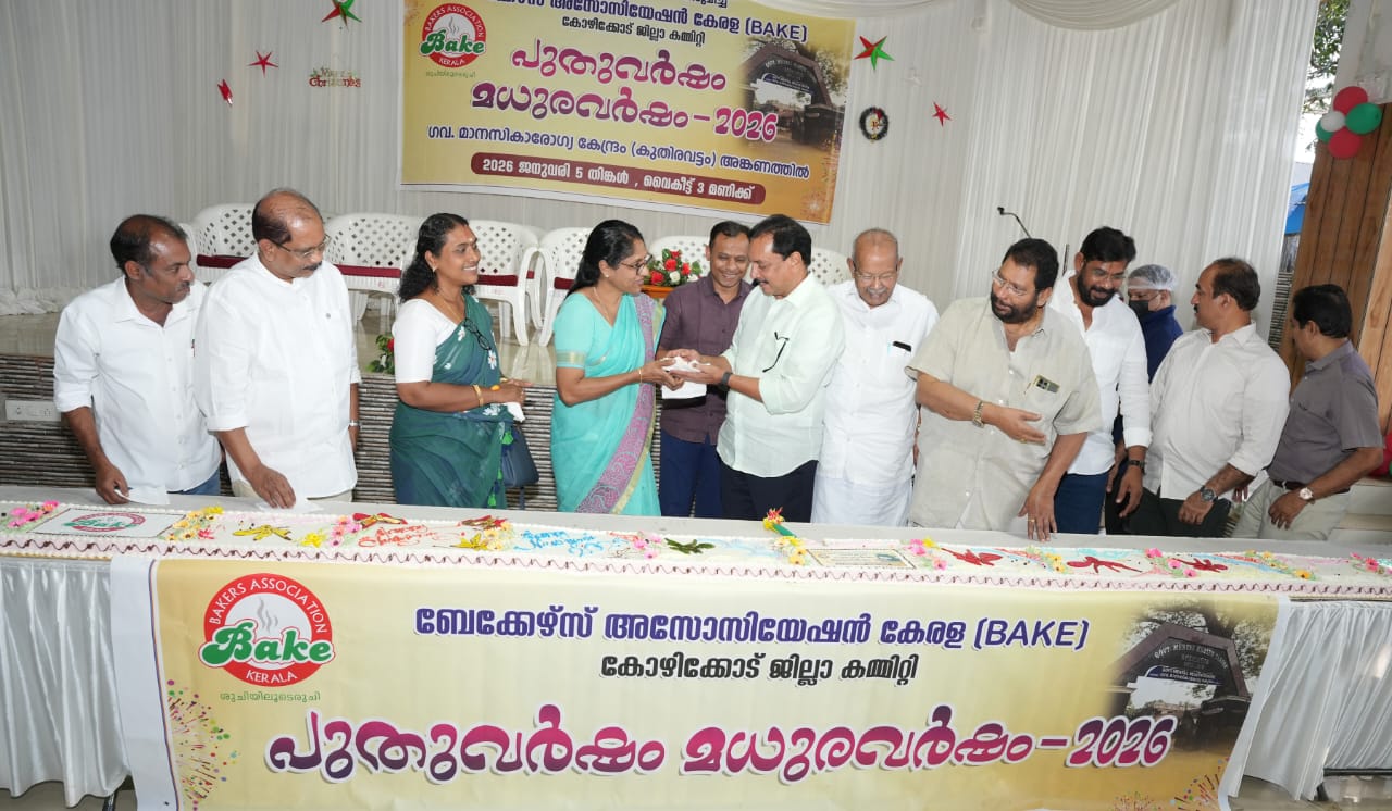 കോഴിക്കോട്:ബേക്കേഴ്സ് അസോസിയേഷൻ കേരള കോഴിക്കോട് ജില്ലാ കമ്മറ്റി നേതൃത്വത്തിൽ പുതുവത്സര ആഘോഷ പരിപാടികൾ സംഘടിപ്പിച്ചു. കുതിരവട്ടം സർക്കാർ മാനസിക ആരോഗ്യ കേന്ദ്രത്തിൽ പുതുവർഷം മധുര വർഷം - 2026 എന്ന പേരിൽ സംഘടിപ്പിച്ച പരിപാടിയിൽ മനുഷ്യാവകാശ കമ്മീഷൻ ജുഡീഷ്യൽ അംഗം കെ.ബൈജു നാഥ് നീളൻ കേക്ക് മുറിച്ച് ആശുപത്രി സൂപ്രണ്ട് ഡോ.സരളയ്ക്ക് നൽകി ഉദ്ഘാടനം ചെയ്തു.ബേക്കഴ്സ്. അസോസിയേഷൻ കേരള മുൻ സംസ്ഥാന ട്രഷറർ എം.പി രമേഷ് അധ്യക്ഷം വഹിച്ചു.വാർഡ് കൗൺസിലർ ബിന്ദു ഉദയകുമാർ, ഷെവലിയർ സി.ഇ ചാക്കുണ്ണി, ബേക്കേഴ്സ് അസോസിയേൻ കേരള ജില്ലാ പ്രസിഡണ്ട്...