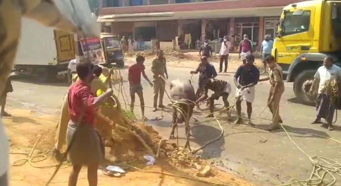 കശാപ്പിനായ് എത്തിച്ച പോത്ത് വിരണ്ടോടി; നാട്ടുകാരും മുക്കം ഫയർഫോഴ്സും സാഹസികമായി പോത്തിനെ പിടികൂടി