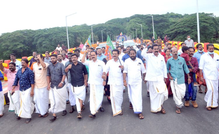 കോഴിക്കോട് മലപ്പുറം ജില്ലകളെ തമ്മിൽ ബന്ധിപ്പിച്ച് ചാലിയാറിന് കുറുകെ നിർമ്മിച്ച പാലത്തിൻ്റെ കോഴിക്കോട് ഭാഗത്തെ പ്രവേശന കവാടം തുറന്ന് കൊടുത്ത് പ്രവർത്തകർ നീങ്ങിയപ്പോൾ പാലത്തിൻ്റെ എതിർ ഭാഗത്ത് മലപ്പുറം ജില്ലയിലെ ബി.ജെ.പ്രവർത്തകരും അഭിവാദ്യം ചെയ്തു.