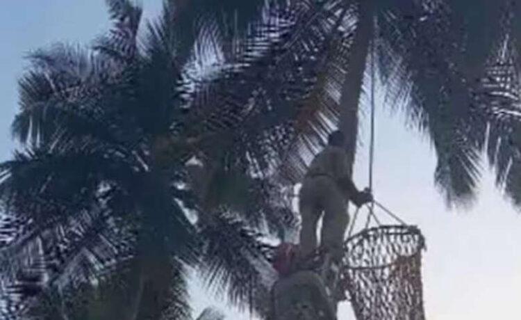 തുടര്ന്ന് നാട്ടുകാര് തിരൂര് അഗ്നിരക്ഷാസേനയെ വിവരം അറിയിക്കുകയായിരുന്നു. വിവരം അറിഞ്ഞെത്തിയ ഫോഴ്സ് ലാഡര്, റെസ്ക്യുനെറ്റ്, റോപ്പ് എന്നിവയുടെ സഹായത്തോടെ ഇയാളെ താഴെയിറക്കി. മരണത്തില് നിന്നു രക്ഷപ്പെട്ട സന്തോഷത്തിലായി പിന്നെ മുഹമ്മദ്. ഒരു തെങ്ങുകയറ്റ തൊഴിലാളിയും റെസ്ക്യു ഓഫിസറും തെങ്ങില് കയറി നെറ്റിലേക്ക് ഇറക്കിയാണ് മുഹമ്മദിനെ രക്ഷിച്ചത്.