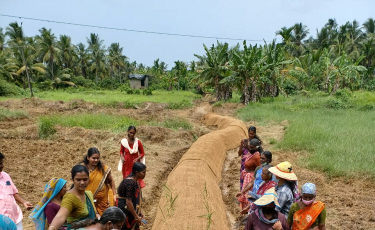എടച്ചേരി ഗ്രാമപഞ്ചായത്തിലെ പതിനാലാം വാർഡിൽ കളിയാം വെള്ളിയിൽ വയൽ വരമ്പിൽ കയർ ഭൂവസ്ത്രം വിരിച്ചു. മഹാത്മാഗാന്ധി ദേശീയ ഗ്രാമീണ തൊഴിലുറപ്പ് പദ്ധതിയിൽ ഉൾപ്പെടുത്തിയാണ് പദ്ധതി നടപ്പാക്കുന്നത്. മഴയിൽനിന്നും ലഭിക്കുന്ന ജലം പരമാവധി ഭൂമിയിലേക്ക് ആഴ്ന്നിറങ്ങാനും, അതിലൂടെ ഭൂഗർഭ ജലത്തിന്റെ അളവ് വർധിപ്പിക്കാനും ഇതിലൂടെ സാധിക്കും. കൂടാതെ വേനലിലെ ജലക്ഷാമത്തിനും ഭൂവസ്ത്രം വിരിക്കുന്നതിലൂടെ ശാശ്വത പരിഹാരം കാണാനാകും.പഞ്ചായത്ത് പ്രസിഡന്റ് എൻ.പത്മിനി ടീച്ചർ ഉദ്ഘാടനം ചെയ്തു. വൈസ് പ്രസിഡന്റ് എം. രാജൻ അധ്യക്ഷത വഹിച്ചു. എ ഇ ഡി. ധന്യ പദ്ധതി വിശദീകരിച്ചു. പഞ്ചായത്ത് അംഗങ്ങളായ നിഷ, ഷീമ വള്ളിൽ, ബാബു തുടങ്ങിയവർ പങ്കെടുത്തു.