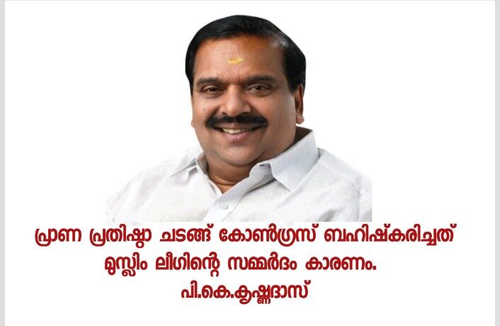 കോഴിക്കോട്:മുസ്ലീം ലീഗിൻ്റെ സമ്മർദ്ദം കാരണമാണ് അയോദ്ധ്യയിലെ ശ്രീരാമ ക്ഷേത്ര പ്രാണപതിഷ്ഠാചടങ്ങ് ബഹിഷ്കരിക്കാൻ കോൺഗ്രസ്സ് തീരുമാനിച്ചത്.പ്രാണപതിഷ്ഠാചടങ്ങ് ബഹിഷ്കരിക്കാനുള്ള കോൺഗ്രസ്സ് നിലപാട് ആശ്വാസകരമെന്ന മുസ്ലീം ലീഗ് സംസ്ഥാന പ്രസിഡൻ്റിൻ്റെ പ്രസ്താവന ഇത് വ്യക്തമാക്കുന്നു. അഞ്ചര പതിറ്റാണ്ട് രാജ്യം ഭരിച്ച കോണ്ഗ്രസിനെ നിയന്ത്രിക്കുന്നത് കേരളത്തിലെ രണ്ട് ജില്ലകളില് മാത്രം സ്വാധീനമുള്ള മുസ്ലീം ലീഗാണെന്നും ഇത് കോൺഗ്രസ്സിന് സംഭവിച്ച രാഷ്ട്രീയ പാപ്പരത്തത്തി ൻ്റെയും സംഘടനാപരമായ തകർച്ചയുടേയും ഉദാഹരണമാണെന്നും