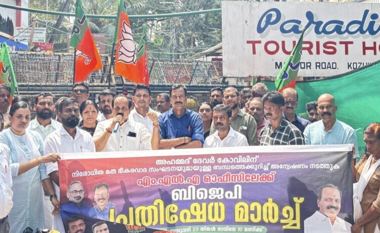 കോഴിക്കോട്: മുൻമന്ത്രിയും കോഴിക്കോട് സൗത്ത് എംഎൽഎയും ആയ മുഹമ്മദ് ദേവർകോവിലിന് നിരോധിത ഭീകരവാദ സംഘടനയുമായുള്ള ബന്ധത്തെക്കുറിച്ച് സമഗ്രമായ അന്വേഷണം നടത്തണമെന്ന് ബിജെപി സംസ്ഥാന സെൽകോർഡിനേറ്റർ വി കെ സജീവൻ ആവശ്യപ്പെട്ടു. ഈ ആവശ്യം ഉന്നയിച്ച് അഹമ്മദ് ദേവർകോവിലിന്റെ എംഎൽഎ ഓഫീസിലേക്ക് ബിജെപി നടത്തിയ പ്രതിഷേധ മാർച്ച് ഉദ്ഘാടനം ചെയ്യുകയായിരുന്നു അദ്ദേഹം. 2022 മുതൽ ഉയർന്നു കേൾക്കുന്ന ആരോപണമാണിത്. ഐഎൻഎല്ലിന്റെ യുവജന വിഭാഗത്തിന്റെ സംസ്ഥാന അധ്യക്ഷൻ തന്നെയാണ് തെളിവ് സഹിതം ഇപ്പോൾ ഇഡിയുടെ സോണൽ ഓഫീസിൽ പരാതി നൽകിയിരിക്കുന്നത്. രാജ്യത്തെ തകർക്കാൻ തീവ്രവാദ ഫണ്ടിങ് നടത്തുന്ന റിഹാബ് ഫൗണ്ടേഷനുമായി അഹമ്മദ് ദേവർകോവിലിന് നേരിട്ട് ബന്ധമുണ്ടെന്നും കോടികളുടെ ഇടപാടുകൾ നടത്തി എന്നും ആണ് പരാതിയിലുള്ളത്. ഇത്തരമൊരു ആളാണ് രണ്ടര വർഷം മന്ത്രിസഭയിൽ ഇരുന്നത്.മുഖ്യമന്ത്രി ഇതിന് മറുപടി പറയണം. രാജ്യമാണ് വലുത് അതുകൊണ്ടുതന്നെ ഭീകരവാദികളുമായിട്ടുള്ള ബന്ധം ഒരു കാരണവശാലും ജനങ്ങൾ വച്ചുപൊറുപ്പിക്കില്ലെന്നും വി കെ സജീവൻ മുന്നറിയിപ്പ് നൽകി.