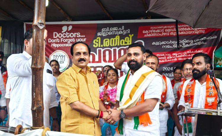 സാധാരണക്കാരുടെ ആശ്രയകേന്ദ്രമായ കോഴിക്കോട് മെഡിക്കൽ കോളേജിൽ തുടര്‍ച്ചയായുണ്ടാകുന്ന ചികിൽത്സാപിഴവിന്‍റെ കുറ്റക്കാർക്കെതിരെ ശക്തമായ നടപടി ആവശ്യപ്പെട്ടുകൊണ്ട് ബി.ജെ.പി. ജില്ലാ സെക്രട്ടറിയും കോര്‍പറേഷന്‍ കൗണ്‍സിലറുമായ ടി. രനീഷിന്‍റെ നേതൃത്വത്തില്‍ ആശുപത്രി കവാടത്തിനു മുൻപിൽ നടത്തിയ