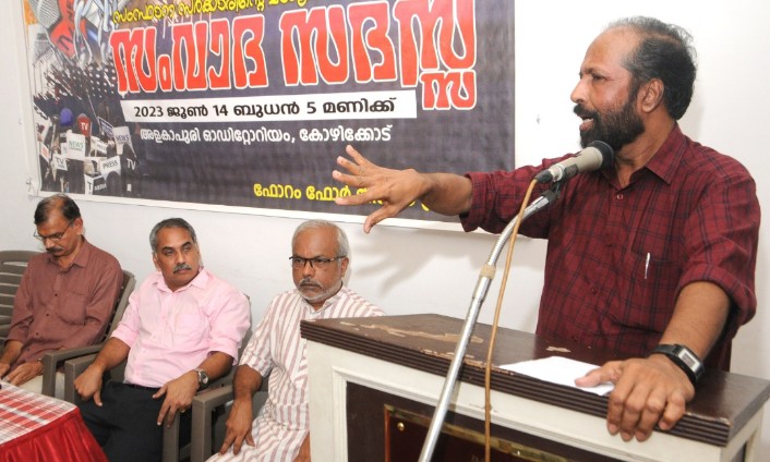 ജനാധിപത്യ വ്യവസ്ഥയിൽ നിന്ന് കേരളം യജമാന ഭരണത്തിലേക്ക് നീങ്ങിക്കൊണ്ടിരിക്കുന്നു. ജനാധിപത്യ വ്യവസ്ഥയിലെ അവസാനത്തെ പ്രതീക്ഷയാണ് നാലാംതൂണായ മാധ്യമങ്ങൾ. മാധ്യമ പ്രവർത്തകർക്ക്ജോലി ചെയ്യാനുള്ള അവസരം നിഷേധിക്കുന്ന പൗരാവകാശ ലംഘനമാണ് കേരളത്തിൽ നടക്കുന്നത്. മാധ്യമ പ്രവർത്തകർക്കെതിരെയുള്ള കേസിൽ കക്ഷി ചേരാൻ തൊഴിലാളി സംഘടനകളും സാംസ്കാരിക പ്രവർത്തകരും തയാറാകണം.നിയമ വിരുദ്ധമായി കേസെടുത്ത പോലീസ് ഉദ്യോഗസ്ഥർക്കെതിരെ നിയമ നടപടികളെടുക്കാൻ തയ്യാറാകണം. അദ്ദേഹം പറഞ്ഞു.