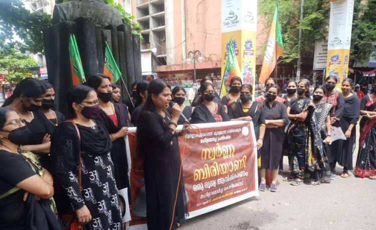 കോഴിക്കോട്: സ്വര്ണ്ണ കള്ളക്കടത്ത് വിഷയത്തില് ആരോപണ വിധേയനായ മുഖ്യമന്ത്രി രാജിവെക്കണമെന്നാവശ്യപ്പെട്ട് മഹിളാ മോര്ച്ചയുടെ നേതൃത്വത്തില് ‘സ്വര്ണ്ണ ബിരിയാണി ദൃശ്യാവിഷ്കരണം’ ഒരുക്കി പ്രതിഷേധം. കറുപ്പ് വസ്ത്രങ്ങളണിഞ്ഞ് മുഖ്യമന്ത്രി പിണറായി വിജയന്റെയും കേസില് ആരോപണ വിധേയരായ സ്വപ്ന സുരേഷ്, ടി. കമല, വീണ പിണറായി, മുഹമ്മദ് റിയാസ്, കെ.ടി. ജലീല്, എം. ശിവശങ്കര്, കെ. സുധാകരന് എന്നിവരുടെ മുഖം മൂടിയും ധരിച്ചാണ് പ്രവര്ത്തകര് ദൃശ്യാവിഷ്ക്കാരണ ആക്ഷേപഹാസ്യത്തില് അണിചേർന്നത്. രാഷ്ട്രീയ നേതാക്കളുടെയും സ്വപ്നയുടെയും ശബ്ദത്തോടൊപ്പം സിനിമയിലെ ഹാസ്യസംഭാഷണങ്ങളും പിന്നണിയേകി. ബിരിയാണിച്ചെമ്പും പ്രതീകാത്മക സ്വര്ണ്ണ ബിസ്ക്കറ്റുമായായിരുന്നു അവതരണം. കിഡ്സണ് കോര്ണറില് നടത്തിയ പുതുമയുള്ള ദൃശ്യാവിഷ്ക്കാര സമരം കാണികള്ക്ക് കൗതുകമായി.