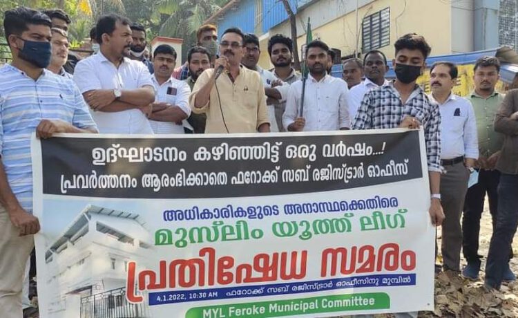 ഫറോക്ക് ;ഉദ്ഘാടനം ചെയ്ത് ഒരു വർഷം കഴിഞ്ഞിട്ടും ഫറോക്ക് സബ് രജിസ്ട്രാർ ഓഫീസ് പ്രവർത്തനമാരംഭിക്കാതെ ജനങ്ങളെ വലയ്ക്കുന്ന സർക്കാർ നടപടിയിൽ പ്രതിഷേധിച്ച് മുസ്ലിം യൂത്ത് ലീഗ് ഫറോക്ക് മുനിസിപ്പൽ കമ്മിറ്റിയുടെ നേതൃത്വത്തിൽ സബ് രജിസ്ട്രാർ ഓഫീസിനു മുൻപിൽ പ്രതിഷേധ സമരം നടത്തി.