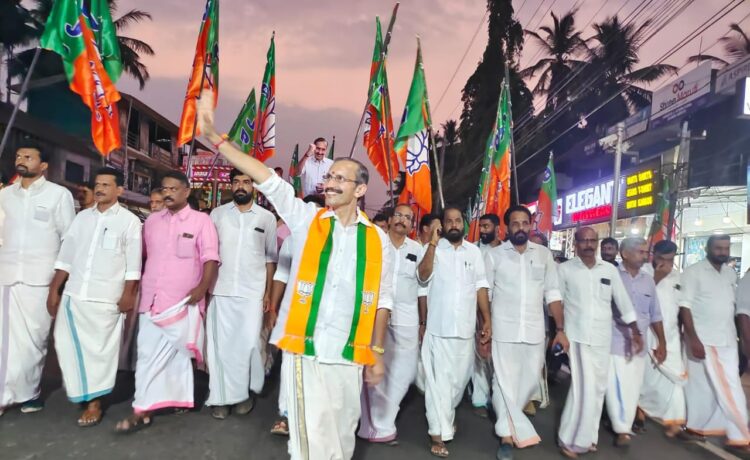 കുന്ദമംഗലം:എൻ.ഡി.എ. കോഴിക്കോട് പാർലമെൻ്റ് മണ്ഡലം സ്ഥാനാർത്ഥി എം.ടി. രമേഷ് കുന്ദമംഗലത്ത് റോഡ് ഷോ നടത്തി. നിയോജക മണ്ഡലം തല പരിപാടി കാരന്തൂർ മർക്കസിന് സമീപത്ത് നിന്ന് ആരംഭിച്ച് കുന്ദമംഗലം അങ്ങാടി ചുറ്റി പുതിയ സ്റ്റാൻ്റിൽ സമാപിച്ചു. വാദ്യമേളങ്ങളും കൊടിതോരണങ്ങളാലും വർണ്ണാഭമായ പരിപാടിയിൽ നൂറ് കണക്കിന് പ്രവർത്തകർ പങ്കെടുത്തു.