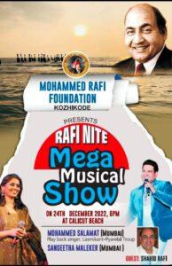 കോഴിക്കോട് : അനശ്വര ഗായകൻ മുഹമ്മദ് റഫിയുടെ 98 ആം ജന്മദിനാഘോഷത്തിന്റെ ഭാഗമായി റഫി ഫൗണ്ടേഷൻ മെഗാ സംഗീത സായാഹ്നം – റഫിനൈറ്റ് മെഗാ മ്യൂസിക്കൽ ഷോ ഒരുങ്ങുന്നു. ഡിസംബർ 24 ന് വൈകുന്നേരം 6 മണിക്ക് കാലിക്കറ്റ് ബീച്ച് ഫ്രീഡം സ്ക്വയർ വേദിയിലാണ് സംഗീത നിശ . നടക്കാവ് ചക്കോരത്ത്കുളം റോട്ടറി യൂത്ത് സെന്റർ ഹാളിൽ നടന്ന പ്രോഗ്രാം ബ്രോഷർ പ്രകാശന ചടങ്ങ് മലബാർ ഗ്രൂപ്പ് കോർപ്പറേറ്റ് എക്സിക്യൂട്ടീവ് ഡയറക്ടർ – എ കെ ഫൈസൽ ഉദ്ഘാടനം ചെയ്തു. ഷോയുടെ ബ്രോഷർ റഫി ഫൗണ്ടേഷൻ മുൻ പ്രസിഡന്റ് ഡോ. മെഹ്റൂഫ് രാജ് , പ്രസിഡന്റ് മെഹ്റൂഫ് മണലൊടിയ്ക്ക് നൽകി പ്രകാശനം നിർവ്വഹിച്ചു.