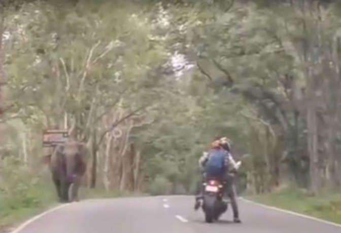 ബൈക്ക് യാത്രികരുടെ പിറകിലുണ്ടായിരുന്ന കാര് യാത്രികരാണ് ദൃശ്യങ്ങള് പകര്ത്തിയത്. റോഡിലും സൈഡിലുമായി രണ്ട് ആനകളാണ് ഉണ്ടായിരുന്നത്. ആനകള് കാട്ടിലേക്ക് പിന്വാങ്ങിയതോടെയാണ് ഇവര് യാത്ര തുടര്ന്നത്.