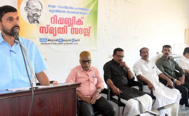 കോഴിക്കോട് : ഇന്ത്യയുടെ മത നിരപേക്ഷത തകർക്കാനുള്ള നീക്കങ്ങൾ അപകടകരമാണെന്ന് കോഴിക്കോട് വിചാരവേദി സംഘടിപ്പിച്ച ‘ അഭിമാനം, മതേതര ഇന്ത്യ ‘ വിഷയത്തിൽ സംഘടിപ്പിച്ച റിപ്പബ്ലിക് സ്മൃതി സദസ്സ് അഭിപ്രായപ്പെട്ടു. വൈവിധ്യമാണ് ഇന്ത്യയുടെ ആത്മാവ്. ഇത് തകർക്കാൻ അനുവദിക്കരുത്. എല്ലാ വിഭാഗം ജനങ്ങൾക്കും ജീവിക്കാനും പ്രവർത്തിക്കാനും സ്വാതന്ത്ര്യം നൽകുന്ന ഭരണഘടന സംരക്ഷിക്കാൻ ഓരോരുത്തർക്കും ബാധ്യതയുണ്ടെന്ന് കോഴിക്കോട് സ്പോർട്സ് കൌൺസിൽ ഹാളിൽ സംഘടിപ്പിച്ച സ്മൃതി സദസ്സ് ചൂണ്ടിക്കാട്ടി.