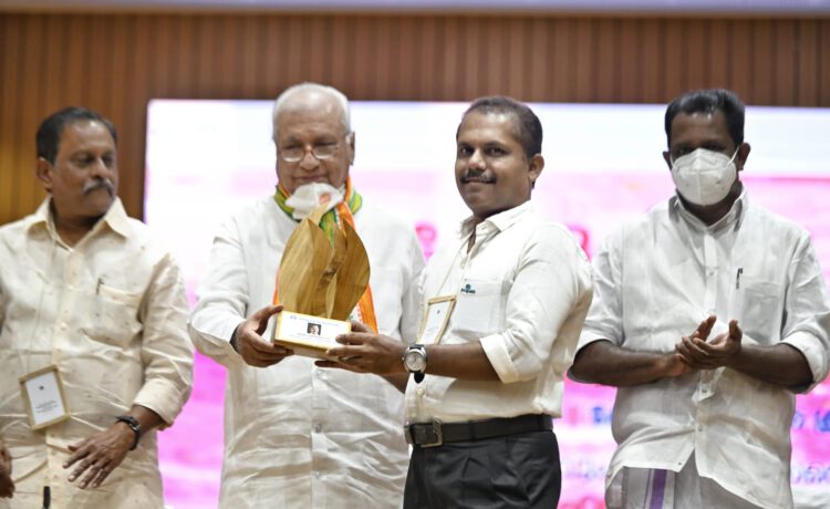 ഏറ്റവും മികച്ച എഡിറ്റോറിയലിനുള്ള വി കരുണാകരൻ നമ്പ്യാർ അവാർഡ് തത്മസയം ദിനപത്രത്തിലെ ചീഫ് സബ് എഡിറ്റർ കെ.സി റിയാസ് ഗവർണറിൽനിന്ന് ഏറ്റുവാങ്ങി.