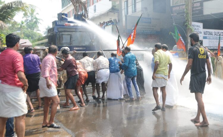 ദേവസ്വം ബോർഡ് ഓഫിസിന് സമീപം പോലീസ് ബാരിക്കേഡ് വെച്ച് തടഞ്ഞു. മാർച്ചിന് നേരെ പോലീസ് ജലപീരങ്കി പ്രയോഗിച്ചപ്പോൾ ഒരടി പോലും പിന്നോട്ട് പോകാതെ മുതിർന്ന വനിതാപ്രവർത്തകരും നേതാക്കളുമുൾപ്പെടെ അതിനെ വളരെ നേരം നേരിട്ടു.ബിജെപി
