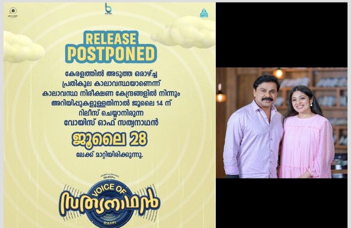 കാലാവസ്ഥ പ്രതികൂലം : ദിലീപ് ചിത്രം വോയ്‌സ് ഓഫ് സത്യനാഥൻ റിലീസ് ജൂലൈ 28ലേക്ക് മാറ്റിയതായി അണിയറപ്രവർത്തകർ